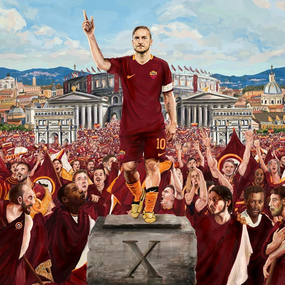 To celebrate Francesco Totti's 25 years as AS Roma's talismanic leader and the limited edition release of the new Tiempo Totti X Roma boots I was commissioned by Nike Football and Mundial Magazine to create a Renaissance inspired painting that heroes the Eighth King of Rome surrounded by his adoring fans. It was a fantastic challenge and really utilised my Art History Masters degree and knowledge of Italian Renaissance and Baroque art. The image went instantly viral around the internet, featured in numerous magazines along with adorning the Soccer AM studio.